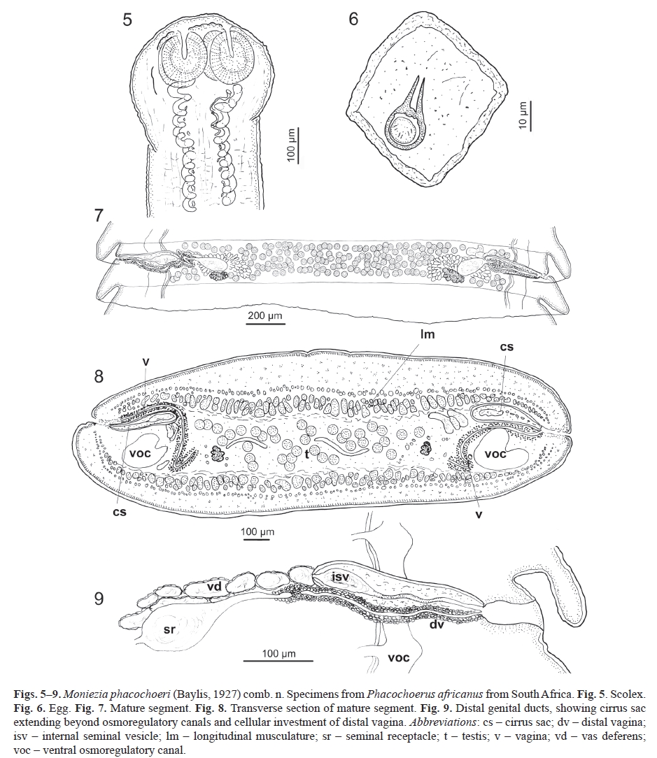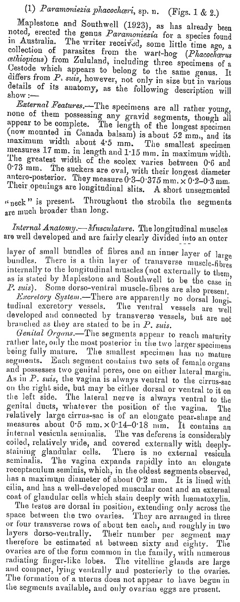Baylis, H. A. 1927. On two adult cestodes from wild swine. Annals and Magazine of Natural History (Ser. 9) 19: 417-425. (5181) Download PDFBeveridge, I. 2014. A review of the genus Paramoniezia Maplestone et Southwell, 1923 (Cestoda: Anoplocephalidae), with a new genus, Phascolocestus, from wombats (Marsupialia) and redescriptions of Moniezia mettami Baylis, 1934 and Moniezia phacochoeri (Baylis, 1927) comb. n. from African warthogs (Artiodactyla). Folia Parasitologica 61: 21–33. (6268) Download PDF |