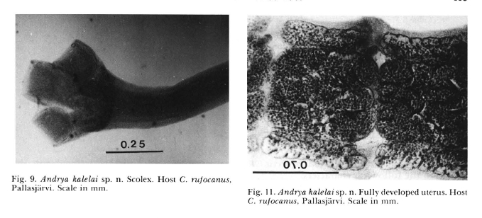 Tenora, F., V. Haukisalmi, and H. Henttonen. 1985. Andrya kalelai sp. n. and (?) Anoplocephaloides sp., Cestoda, Anoplocephalidae, parasites of Clethrionomys-rodents in Finland. Annales Zoologici Fennici 22: 411-416. (5102) Download PDFTenora, F, É. Murai, and C. Vaucher. 1986. On Andrya Railliet, 1893 and Paranoplocephala Lühe, 1910 (Cestoda, Monieziinae). Parasitologica Hungarica 19: 43-75. (4636) Download PDF |