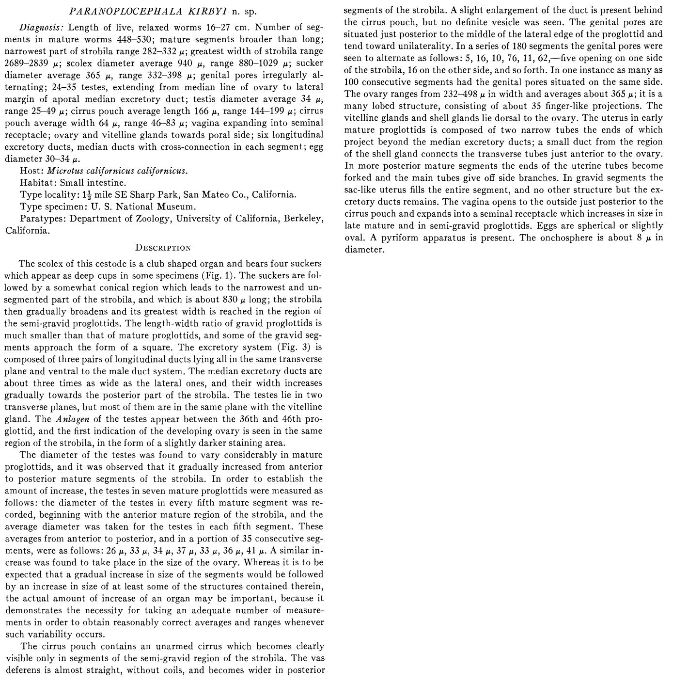 Voge, M. 1948. A new anoplocephalid cestode, Paranoplocephala kirbyi, from Microtus californicus californicus. Transactions of the American Microscopical Society 67: 299 -303. (5103) Download PDF |