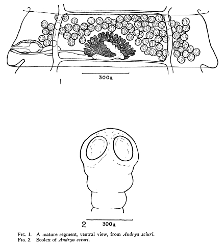Rausch, R. 1947. Andrya sciuri n. sp., a cestode from the northern flying squirrel. Journal of Parasitology 33: 316-318. (4742) Download PDFTenora, F., É. Murai, and C. Vaucher. 1984. On Anoplocephalidae (Cestoda), parasitizing Rodentia and Lagomorpha in Europe. Parasitologica Hungarica 17: 51-57. (4629) Download PDF |