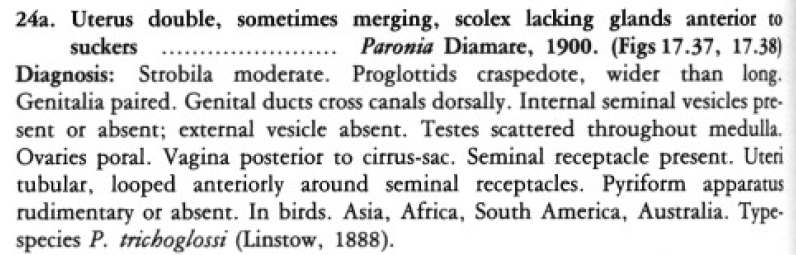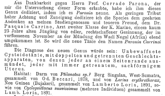Diamare, V. 1900. Paronia carrinoi, n. g. n. sp. von Tänioiden mit doppelten Geschlechtsorganen. Centralblatt für Bakteriologie und Parasitenkunde, I abt. 28: 846-850.