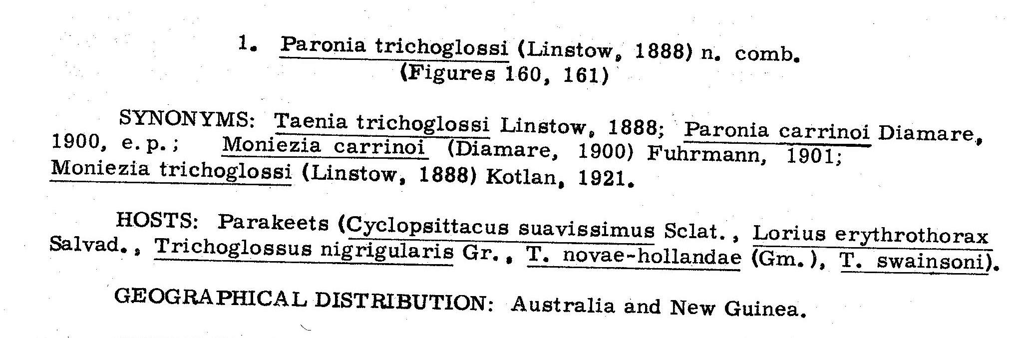 | Synonyms | Taenia trichoglossi Linstow, 1888; Moniezia trichoglossi (Linstow, 1888) Kotlan, 1921; Paronia carrinoi Diamare, 1900 (in part); Moniezia carrinoi (Diamare, 1900) Fuhrmann, 1901. |