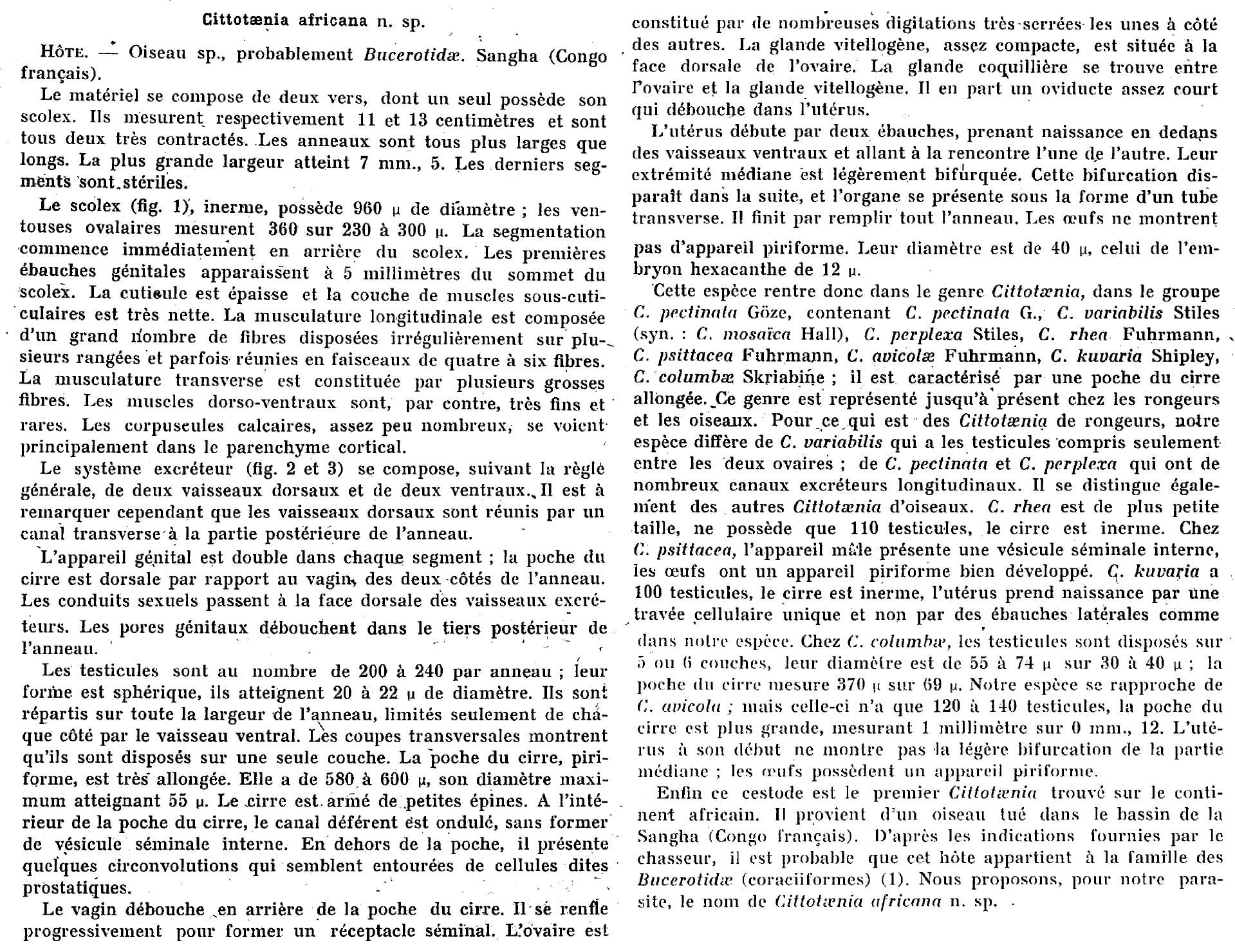 Joyeux, C. and J-G. Baer. 1927. Etude de quelques cestodes provenant des colonies francaises d’Afrique et de Madagascar. Annales de Parasitologie Humaine et Comparee 5: 27-35. (5029) Download PDFSpasskii, A. A. 1951. Anoplocefalyaty - lentochnye gel'minty domashnyh i dikih zhivotnyh [Anoplocephalate tapeworms of domestic and wild animals]. Osnovy Cestodologii, Vol. 1. K. I. Skrjabin (ed). Izdatel'stvo Akademii Nauk SSSR, Moscow, 735 pp. (2641) Download PDF |