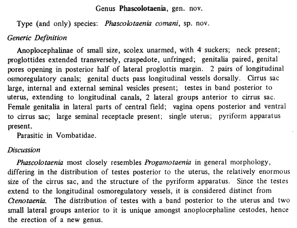 | Type Species | Phascolotaenia comani Beveridge, 1976 |