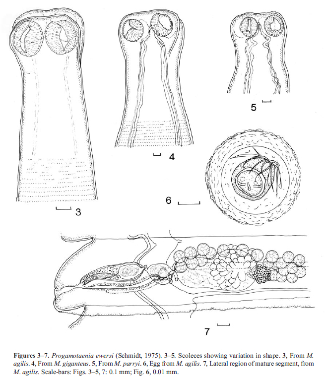 Beveridge, I. 2009. A re-description of Progamotaenia ewersi (Schmidt, 1975) (Cestoda: Anoplocephalidae) from wallabies and kangaroos (Macropodidae), with the description of a new species, P. ualabati n. sp. Transactions of the Royal Society of South Australia 133: 1-17. (4682) Download PDF |