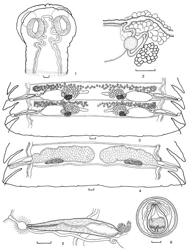 canals. 2. Female genital organs of mature proglottid with young tubular uterus, seminal receptacle to left of Mehlis' gland (center), and multilobulate ovary anterior to smaller vitellarium. 3. Adjacent mature proglottids of holotype showing variation in testis distribution. Velum is shown on posterior proglottids only. 4. Gravid proglottid; velum is shown on posterior proglottid only. 5. Cirrus sac and vagina, showing tiny spines in distal part of cirrus. 6. Egg, showing pyriform apparatus surrounding oncosphere. Scales: Figs. 1-5, 100 am; Fig. 6, 10 rum.