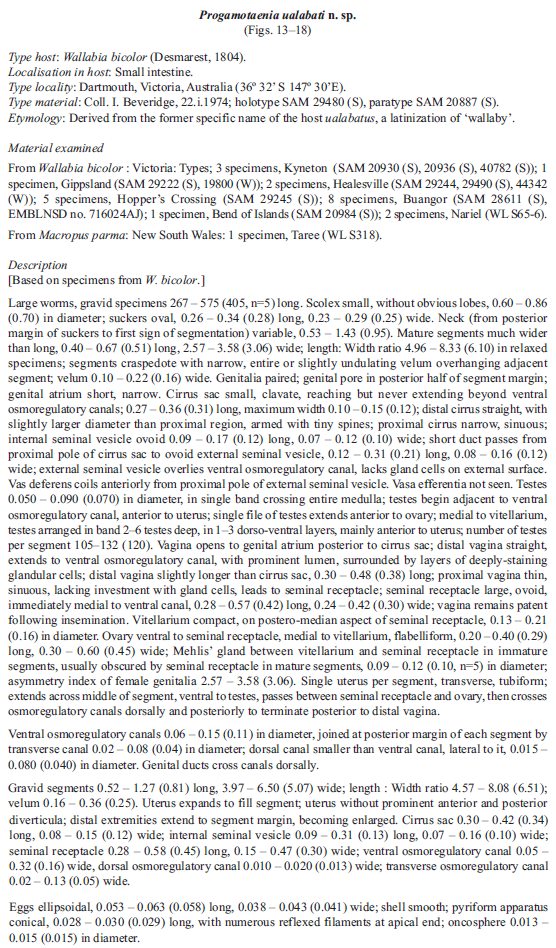 Beveridge, I. 2009. A re-description of Progamotaenia ewersi (Schmidt, 1975) (Cestoda: Anoplocephalidae) from wallabies and kangaroos (Macropodidae), with the description of a new species, P. ualabati n. sp. Transactions of the Royal Society of South Australia 133: 1-17. (4682) Download PDF |