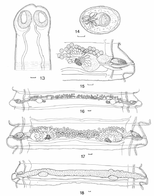 Figures 13–18. Progamotaenia ualabati n. sp. from Wallabia bicolor. 13, Scolex. 14, Egg. 15, Lateral margin of mature segment. 16, Immature segment; note testes are distributed mainly anterior to uterus. 17, Mature segment. 18, Gravid segment. Scale-bars: Figs. 13, 15–18, 0.1 mm; Fig. 14, 0.01 mm.