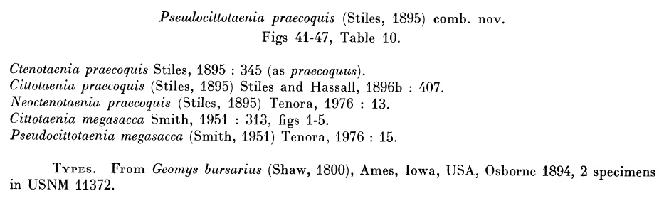 Synonyms Ctenotaenia praecoquis Stiles, 1895; Cittotaenia praecoquis (Stiles, 1895) Stiles & Hassall, 1896; Neoctenotaenia praecoquis (Stiles, 1895) Tenora, 1976; Cittotaenia megasacca Smith, 1951; Pseudocittotaenia megasacca (Smith, 1951) Tenora, 1976