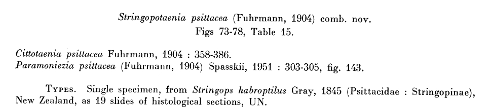 | Synonyms | Cittotaenia psittacea Fuhrmann, 1904; Paramoniezia psittacea (Fuhrmann, 1904) Spasskii, 1951 |