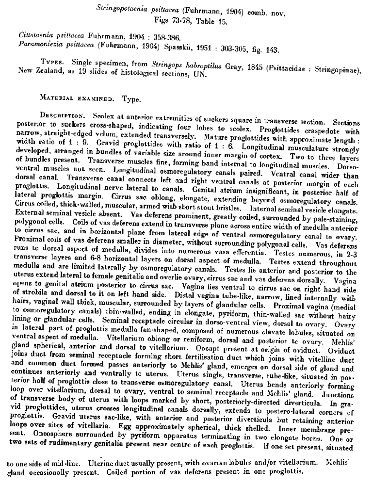 Fuhrmann, O. 1904. Neue Anoplocephaliden der Vögel. Zoologischer Anzeiger 27: 384-388. (4906) Download PDFBeveridge, I. 1978. A taxonomic revision of the genera Cittotaenia Riehm, 1881, Ctenotaenia Railliet, 1893, Mosgovoyia Spasskii, 1951 and Pseudocittotaenia Tenora, 1976. (Cestoda: Anoplocephalidae). Mémoires du Muséum National d’Histoire Naturelle 107: 1-64. (4907) Download PDF |