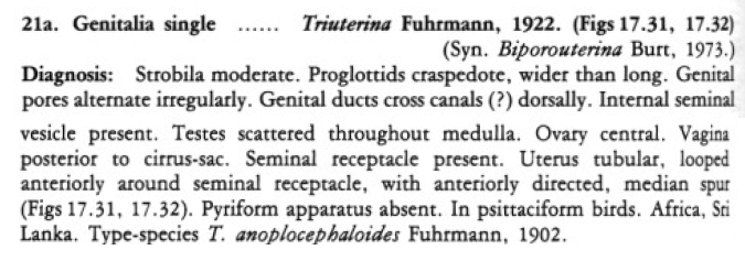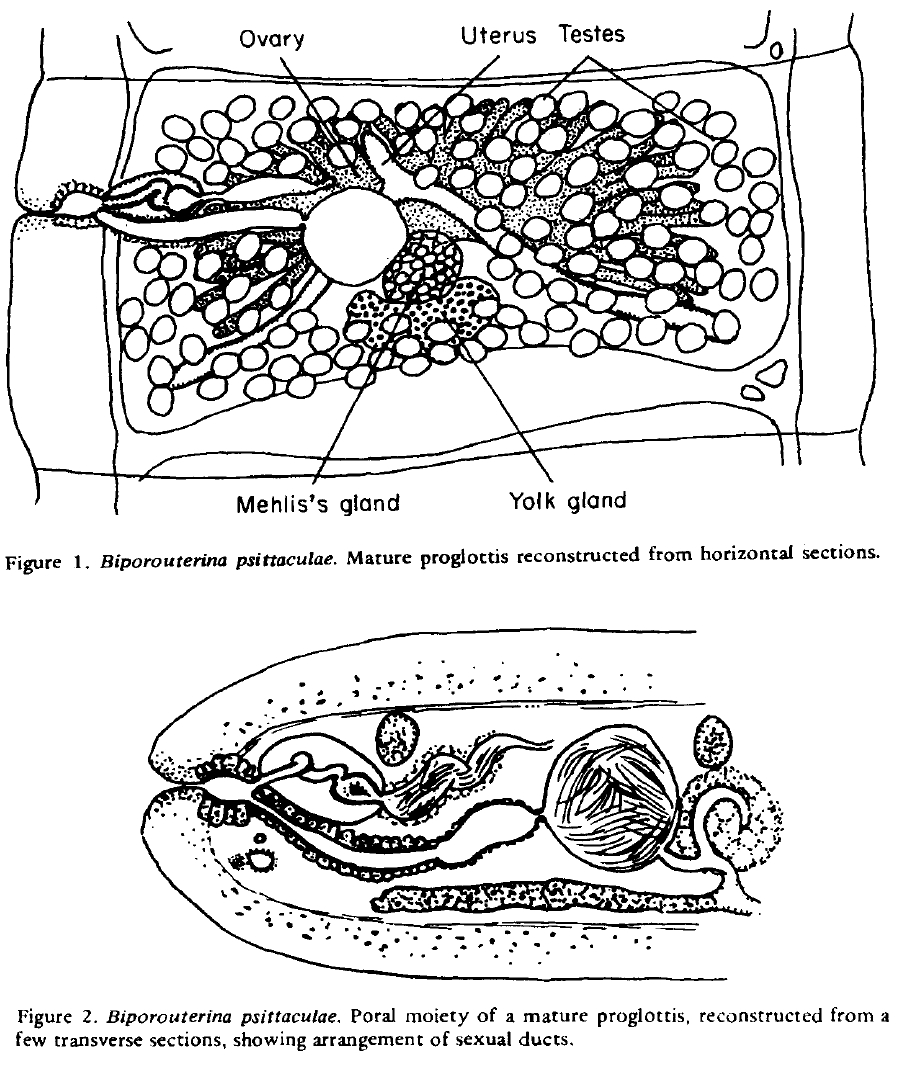 Burt, D. R. R. 1973. On a new anoplocephalid cestode Biporouterina psittaculae gen. et sp. nov. from Layard’s paroquet Psittacula calthropae (Layard 1849). Zoological Journal of the Linnean Society 53: 81-86. (4964) Download PDFBeveridge, I. 1994. Family Anoplocephalidae Cholodkovsky, 1902. Keys to the Cestode Parasites of Vertebrates. : 315-366. (4599) Download PDF |