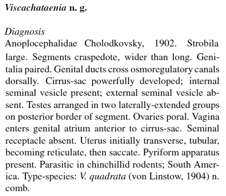 | Type Species | Viscachataenia quadrata (Linstow, 1904) Denegri, Dophic, Elissondo & Beveridge, 2003 |