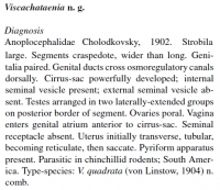 Denegri, G., M. C. Dopchiz, M. C. Elissondo, and I. Beveridge. 2003. Viscachataenia n. g., with the redescription of V. quadrata (von Linstow, 1904) n. comb. (Cestoda: Anoplocephalidae) in Lagidium viscacia (Rodentia: Chinchillidae) from Argentina. Systematic Parasitology 54: 81-88. (5134) Download PDF |