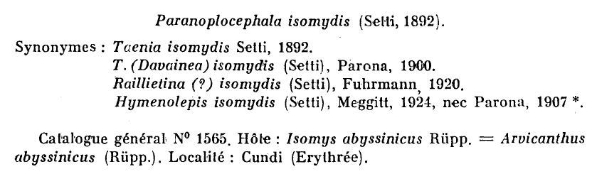 Setti, E. 1892. Elminti dell Eritrea e delle regioni limitrofe. Atti della Società ligustica di scienze naturali e geografiche 4: 10-13. (4616) Download PDFBaer, J. G. 1949. Contributions à la faune helminthologique africaine. Acta Tropica 6: 41-45. (4625) Download PDF |