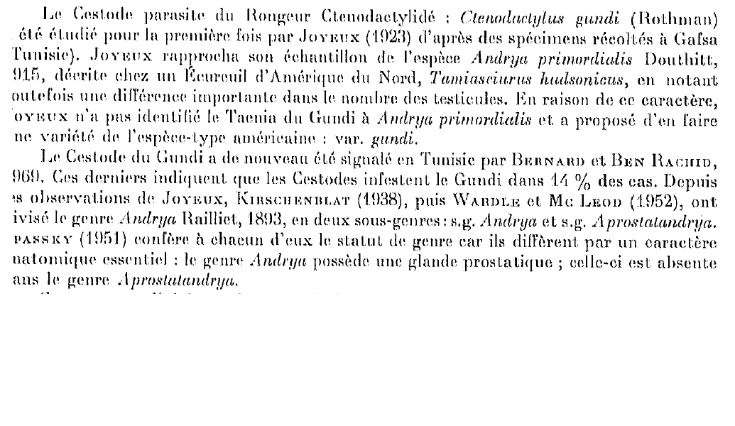 Joyeux, C. 1923. Recherches sur la faune helminthologique Africaine. Archives de l’Institut Pasteur de Tunis 12: 119-167. (3044) Download PDFQuentin, J.-C. 1979. Anatomie et taxonomie d Aprostatandrya gundi (Joyeux, 1923), cestode parasite du rongeur Ctenodactylus gundi (Rothman). Bulletin du Museum National d Histoire Naturelle Section A Zoologie Biologie et Ecologie Animales 1: 251-256. (4630) Download PDF |