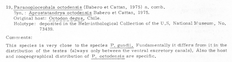 Babero, B. B. and P. E. Cattan. 1975. Helmintofauna de Chile: III. Parásitos del roedor degú, Octodon degus Molina, 1782, con la descripción de tres nuevas especies. Boletín Chileno de Parasitología 30: 68-76. (4634) Download PDFTenora, F, É. Murai, and C. Vaucher. 1986. On Andrya Railliet, 1893 and Paranoplocephala Lühe, 1910 (Cestoda, Monieziinae). Parasitologica Hungarica 19: 43-75. (4636) Download PDF |