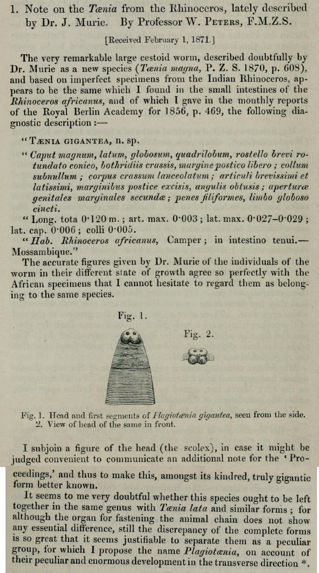 Peters, W. 1871. Note on the Taenia from the rhinoceros lately described by R. J. Murie. Proceedings of the Zoological Society of London 1871: 146-147.