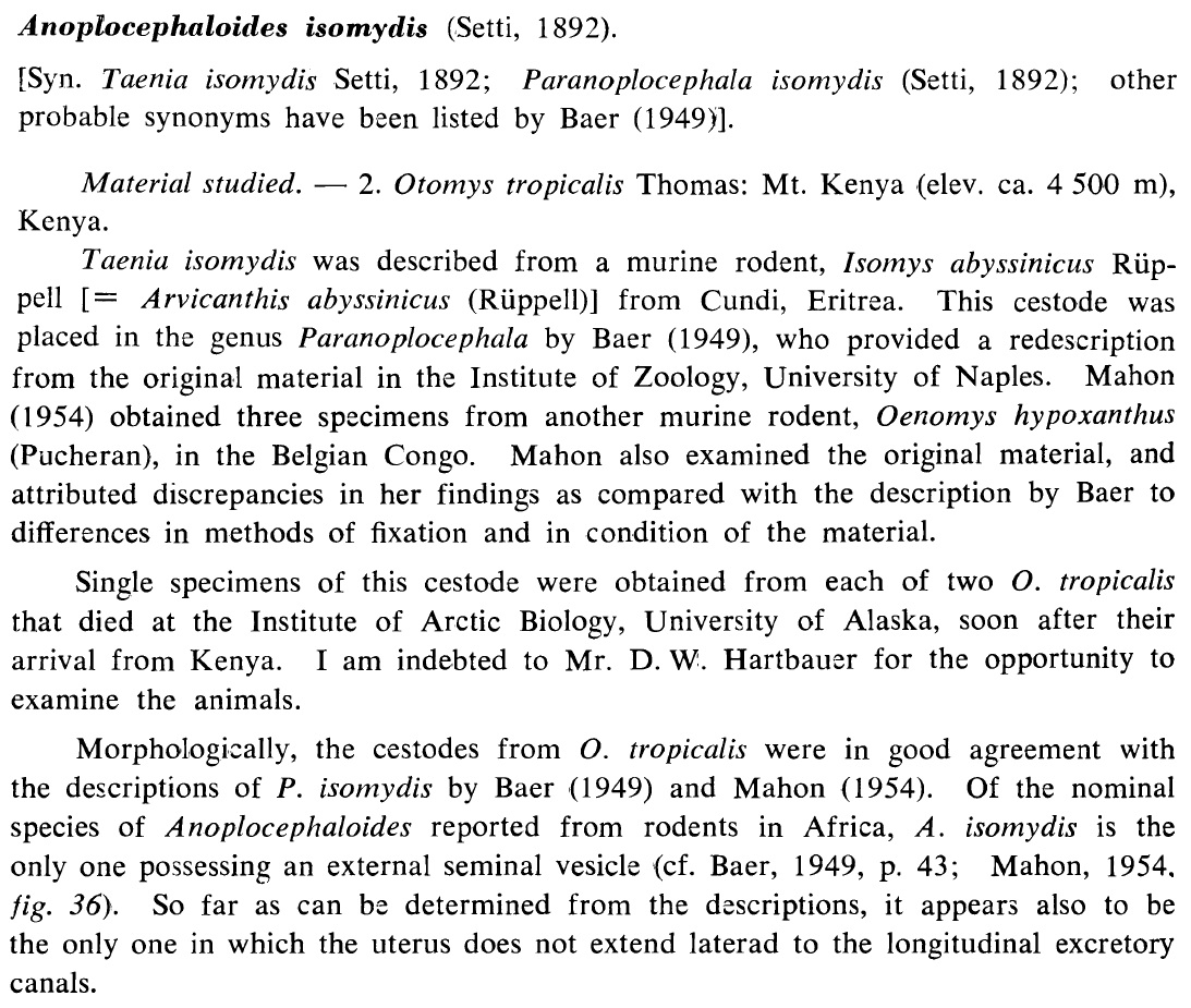 Setti, E. 1892. Elminti dell Eritrea e delle regioni limitrofe. Atti della Società ligustica di scienze naturali e geografiche 4: 10-13. (4616) Download PDFRausch, R. L. 1976. The genera Paranoplocephala Lühe, 1910 and Anoplocephaloides Baer, 1923 (Cestoda: Anoplocephalidae), with particular reference to species in rodents. Annales de Parasitologie Humaine et Comparée 51: 513-562. (4624) Download PDF |