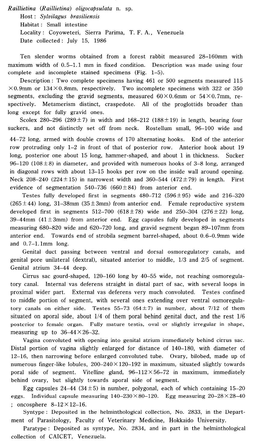 | Type Material | Helminthological Collection, No. 2833, in the Department of Parastiology, Faculty of Veterinary Medicine, Hokkaido University (syntype) paratype deposited as syntype, No. 2834, and in part in the helminthological Collection of CAICET, Venezuela |