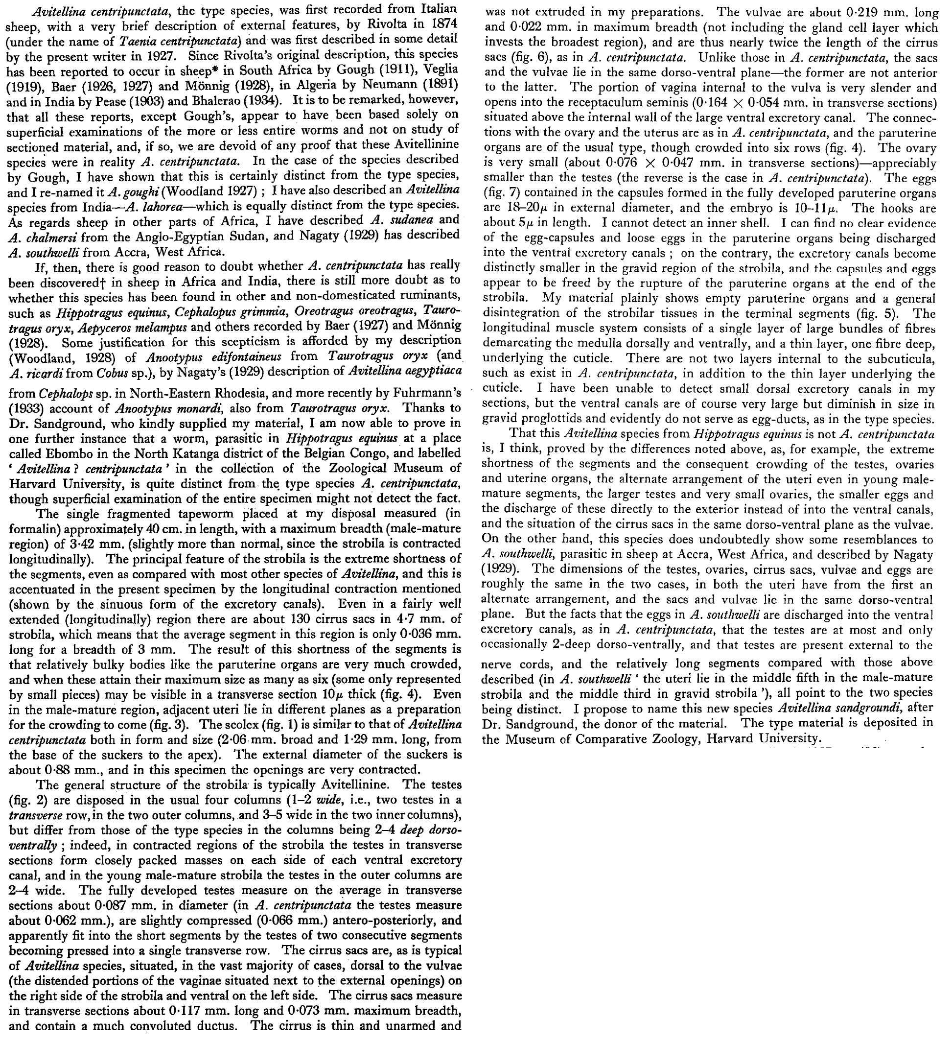 Woodland, W. N. F. 1935. A new species of avitelline tapeworm, Avitellina sandgroundi, from Hippotragus equinus. Annals of Tropical Medicine and Parasitology 29: 185-190. (4974) Download PDF |