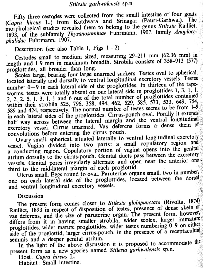 | Scientific Name Notes | Probably a junioe synonym of Stilesia globipunctata (Rivolta, 1874) Railliet, 1893. |