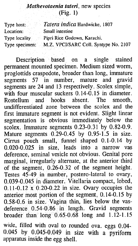 Ghazi, R. R., F. M. Bilqees, and Noor-Un-Nisa. 2002. Mathevotaenia tateri sp. n. from Tatera indica Hardwicke, 1807 with a note on its public health importance. Pakistan Journal of Zoology 34: 279–281. (5428) Download PDF |