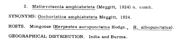 | Scientific Name Notes | Synonym of Mathevotaenia erinacei (Meggitt, 1920) Spasskii, 1951 in Meggitt (1934) and Schmidt (1986). |