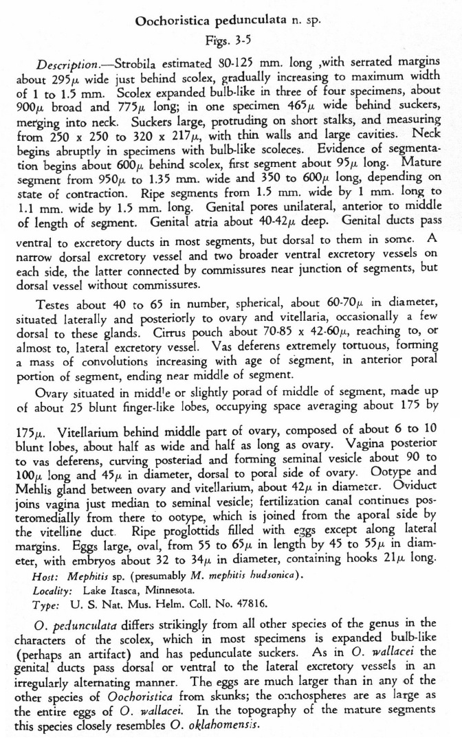 Chandler, A. C. 1952. Two new species of Oochoristica from Minnesota skunks. American Midland Naturalist 48: 69–73. (5020) Download PDFBeveridge, I. 2008. Mathevotaenia niuguiniensis n. sp. (Cestoda: Anoplocephalidae: Linstowiinae) from the water-rat Parahydromys asper (Thomas) in Papua New Guinea, with a list of species of Mathevotaenia Akumyan, 1946. Systematic Parasitology 71: 189-198. (4528) Download PDF |