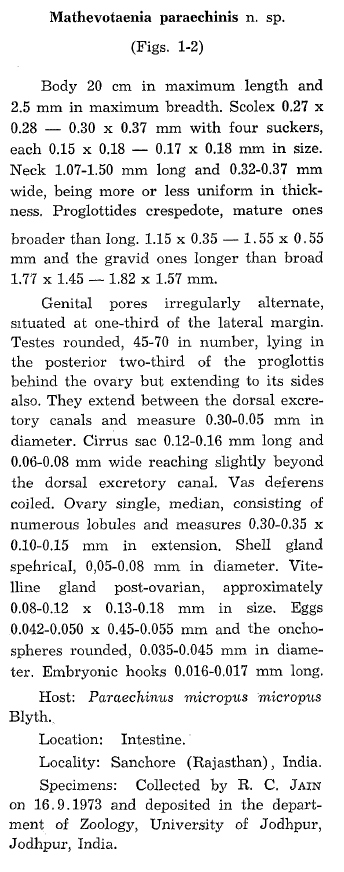 Nama, H. S. 1975. On a new species of Mathevotaenia (Cestoda: Anoplocephalidae) from the hedgehog Paraechinus micropus micropus Blyth. Revista Brasiliera de Biologia 35: 117–119. (5570) Download PDF |