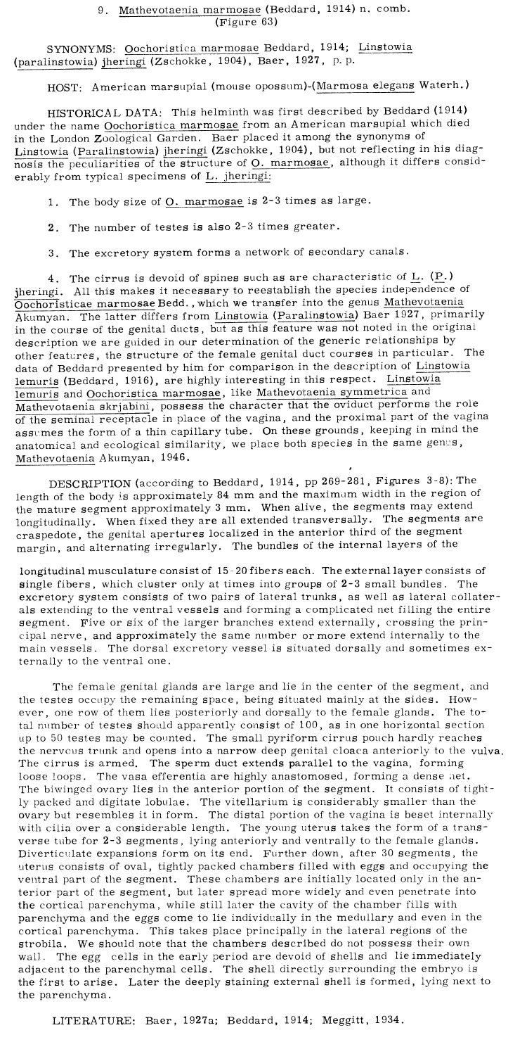 Beddard, F. E. 1914. Contributions to the anatomy and systematic arrangement of the Cestoidea. XIII. On two new species belonging to the genera Oochoristica and Linstowia, with remarks upon those genera. Proceedings of the Zoololgical Society of London 1914(1): 263-283. (5017) Download PDFSpasskii, A. A. 1951. Anoplocefalyaty - lentochnye gel'minty domashnyh i dikih zhivotnyh [Anoplocephalate tapeworms of domestic and wild animals]. Osnovy Cestodologii, Vol. 1. K. I. Skrjabin (ed). Izdatel'stvo Akademii Nauk SSSR, Moscow, 735 pp. (2641) Download PDF |