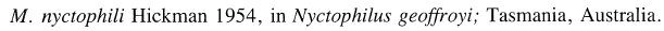 | Synonyms | Oochoristica nyctophili Hickman, 1954; Hickmawia (Hickman, 1954) Spasskii, 1987 |