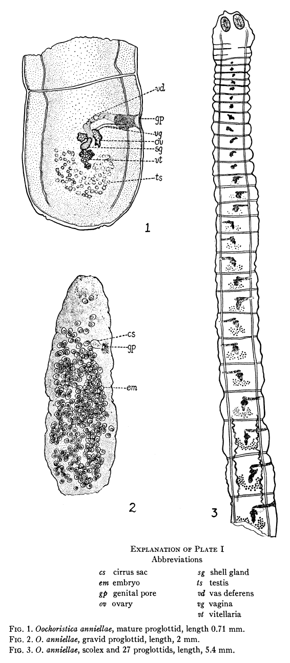 Stunkard, H. W and W. F. Lynch. 1944. A new anoplocephaline cestode, Oochoristica anniellae, from the California limbless lizard. Transactions of the American Microscopical Society 63: 165-169. (5065) Download PDF |
