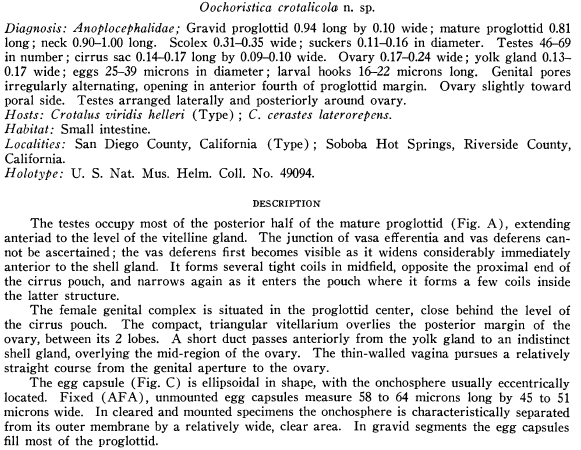 Alexander, C. G. and E. P. Alexander. 1957. Oochoristica crotalicola, a new anoplocephalid cestode from California rattlesnakes. Journal of Parasitology 43: 365-366. (4691) Download PDF |