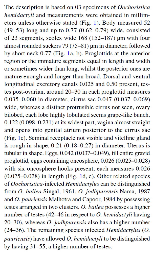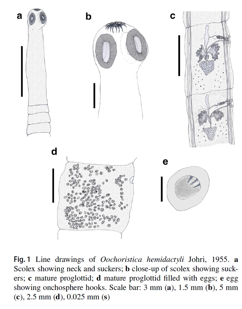 Verma, C, A. Chaudhary, B. Sharma, and H. S. Singh. 2020. First report of molecular characterization of Oochoristica hemidactyli Johri, 1955 from the common wall lizard, Hemidactylus brooki Gray, 1845 (Reptilia: Gekkonidae) along with morphological redescription. Acta Parasitologica 65: 250-255. (7461) Download PDF |