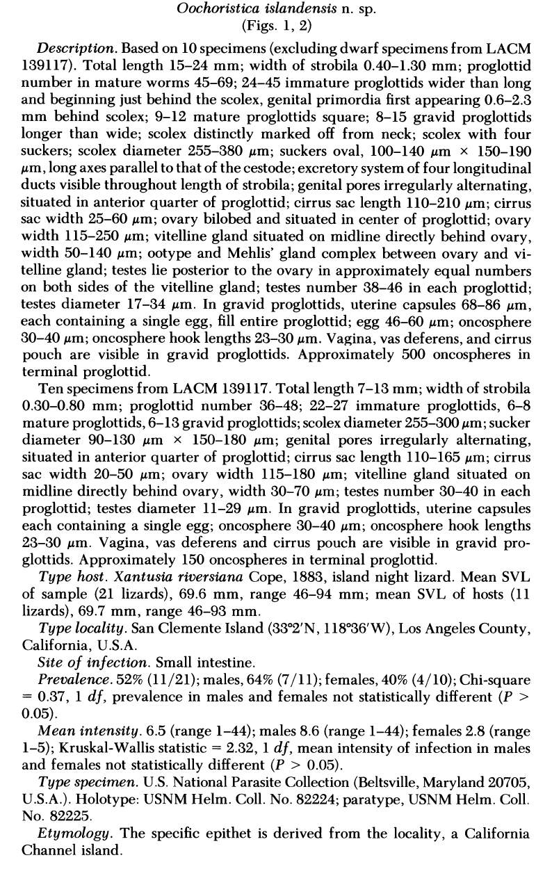 Bursey, C. R. and S. R. Goldberg. 1992. Oochoristica islandensis n. sp. (Cestoda: Linstowiidae) from the Island Night lizard, Xantusia riversiana (Sauria: Xantusiidae). Transactions of the American Microscopical Society 111: 302-313. (4721) Download PDF |