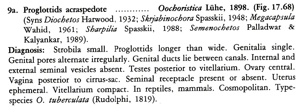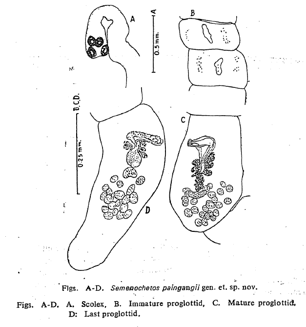Palladwar, T. D. and S. D. Kalyankar. 1989. On two new tapeworms from Indian vertebrates. Indian Journal of Helminthology (Supplement: Fotedar Commemoration Volume) 41: 191-196. (5657) Download PDFBeveridge, I. 1994. Family Anoplocephalidae Cholodkovsky, 1902. Keys to the Cestode Parasites of Vertebrates. : 315-366. (4599) Download PDF |