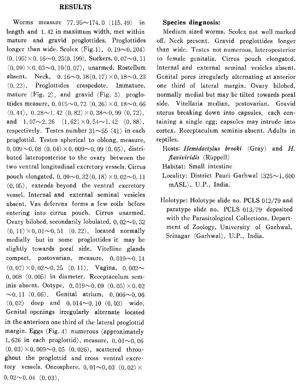| Type Material | Parasitological collections, Department of Zoology, University of Garhwal, Srinagar. Holotype: PCLS 012/79. Paratype: PCLS 013/79. |