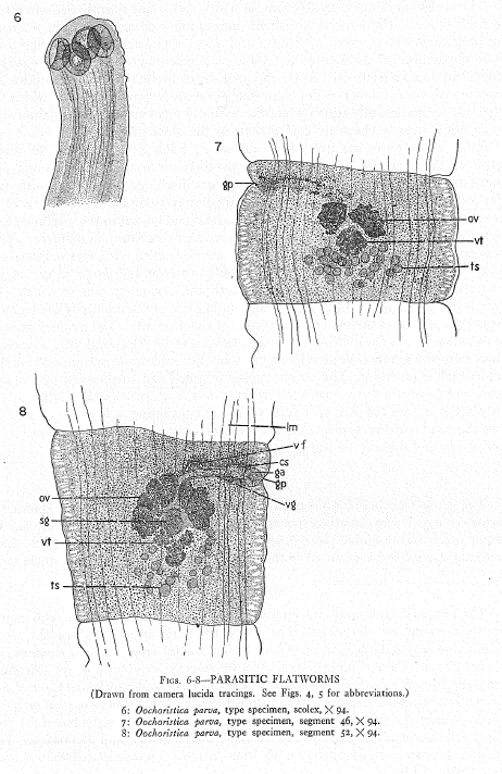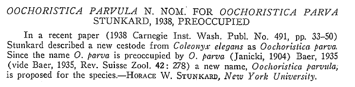 Stunkard, H. W. 1938. Parasitic flatworms from Yucatan. Publications of Carnegie Institute of Washington 491: 33–50. (5590) Download PDFStunkard, H. W. 1938. Oochoristica parvula n. nom. for Oochoristica parva Stunkard, 1938, preoccupied. Journal of Parasitology 24: 554. (5591) Download PDF |