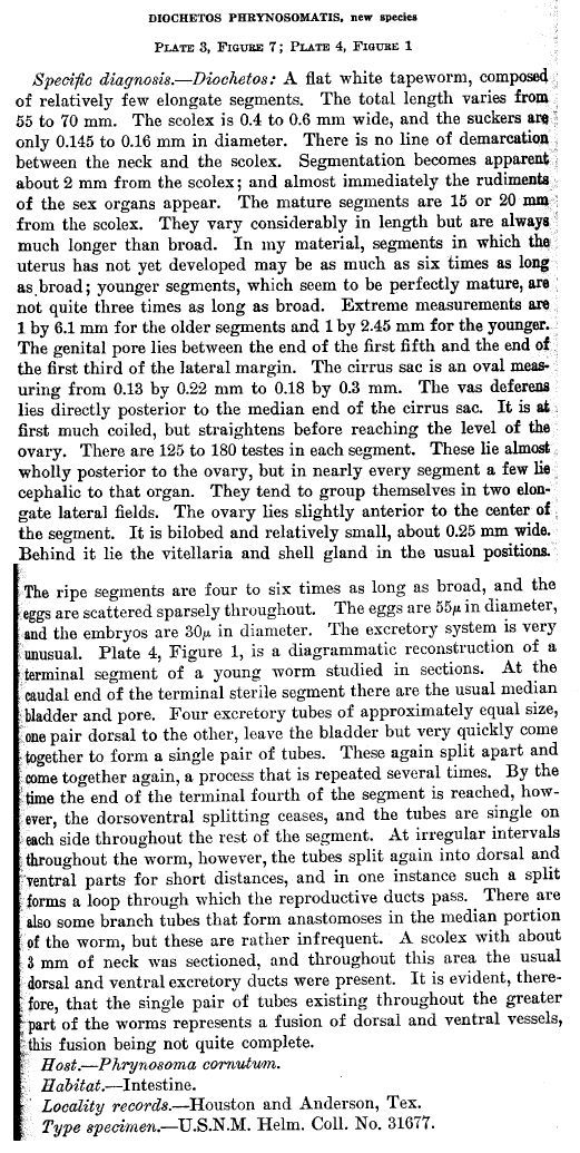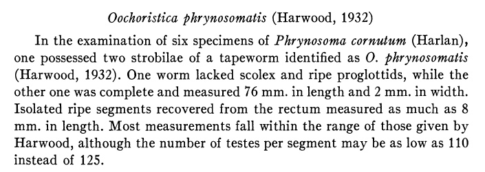 Harwood, P. D. 1932. The helminths parasitic in the Amphibia and Reptilia of Houston, Texas, and vicinity. Proceedings of the United States National Museum 81: 1-71. (4032) Download PDFLoewen, S. L. 1940. On some reptilian cestodes of the genus Oochoristica (Anoplocephalidae). Transactions of the American Microscopical Society 59: 511 -518. (5069) Download PDF |