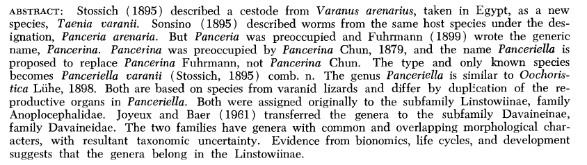 Stunkard, H. W. 1969. Panceriella nom. n., for Pancerina Fuhrmann, 1899, preoccupied by Pancerina Chun, 1879, and systematic relations of the genus. Journal of Parasitology 55: 1162-1168.