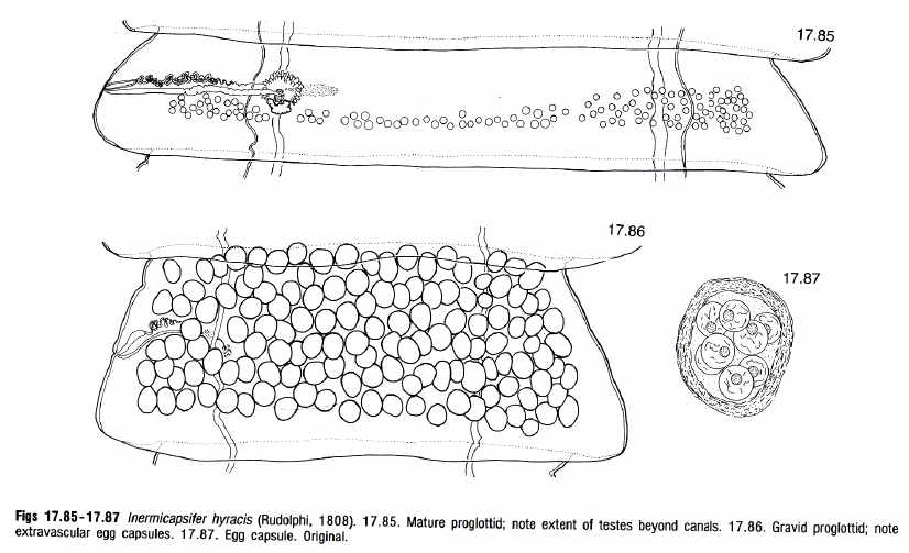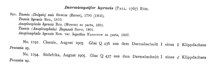 | Scientific Name Notes | Additional synonyms according to Spasskii (1951): Arhynchotaenia critica Pagenstecher, 1878; Taenia (Anoplocephala) ragazzi Setti, 1891; Inermicapsifer capensis Beddard, 1912; Hyracotaenia hyracis Beddard, 1912; Zschokkeella hyracis (Beddard) Beddard, 1912; Zschokkeella capensis (Beddard) Beddard, 1912; Inermicapsifer criticus (Pagenstecher, 1878) Bischoff, 1913. |