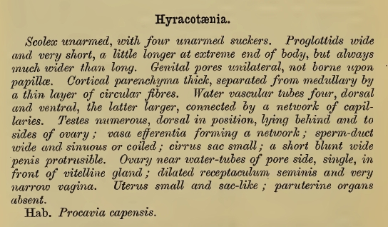| Scientific Name Notes | Type species not assigned. Two species included in Hyracotaenia: H. procaviae Berddard, 1912 and H. hyracis Beddard, 1912. Spasskii (1951) treats H. procaviae as a junior synonym of Pericapsifer pagenstecheri (Setti, 1897) Spasskii, 1951. |