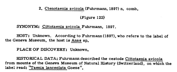 Fuhrmann, O. 1897. Sur un nouveau Ténia d’Oiseau (Cittotaenia avicola). Revue Suisse de Zoologie 5: 107-117. (5051) Download PDFSpasskii, A. A. 1951. Anoplocefalyaty - lentochnye gel'minty domashnyh i dikih zhivotnyh [Anoplocephalate tapeworms of domestic and wild animals]. Osnovy Cestodologii, Vol. 1. K. I. Skrjabin (ed). Izdatel'stvo Akademii Nauk SSSR, Moscow, 735 pp. (2641) Download PDF |