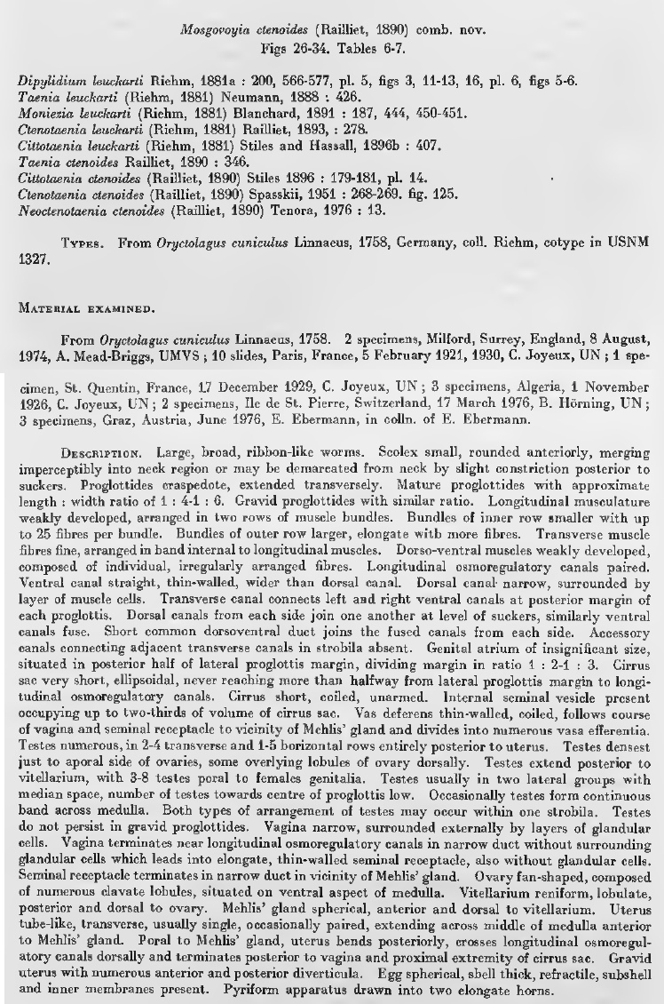 Railliet, A. 1890. Une nouvelle affection parasitaire du lièvre et du lapin garenne. Revue des Sciences Naturelles Appliquées 37: 345-352. (5062) Download PDFBeveridge, I. 1978. A taxonomic revision of the genera Cittotaenia Riehm, 1881, Ctenotaenia Railliet, 1893, Mosgovoyia Spasskii, 1951 and Pseudocittotaenia Tenora, 1976. (Cestoda: Anoplocephalidae). Mémoires du Muséum National d’Histoire Naturelle 107: 1-64. (4907) Download PDF |