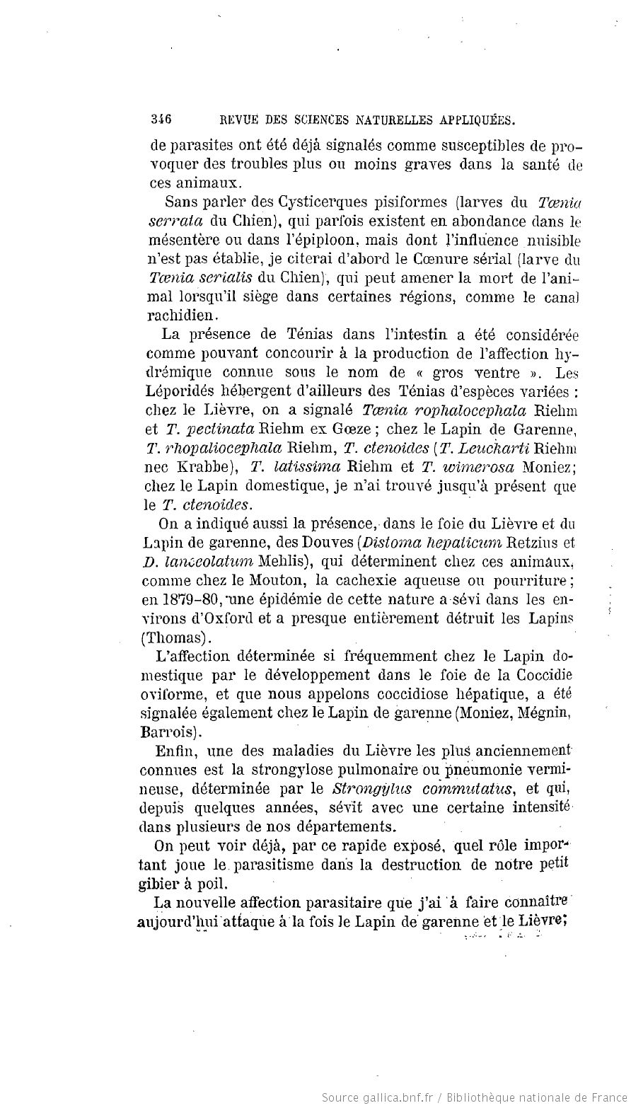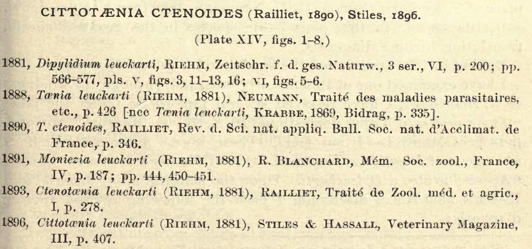 Railliet, A. 1890. Une nouvelle affection parasitaire du lièvre et du lapin garenne. Revue des Sciences Naturelles Appliquées 37: 345-352. (5062) Download PDFStiles, C. W. 1896. A revision of the adult tapeworms of hares and rabbits. Proceedings of the U. S. National Museum 19: 145-235. (4883) Download PDF |