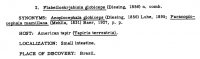 Diesing, K. M. 1856. Zwanzig Arten von Cephalocotyleen. Denkschriften der Kaiserlichen Akademie der Wissenschaften. Matematisch-Naturwissenschaftliche classe 12: 23-38. (4967) Download PDFSpasskii, A. A. 1951. Anoplocefalyaty - lentochnye gel'minty domashnyh i dikih zhivotnyh [Anoplocephalate tapeworms of domestic and wild animals]. Osnovy Cestodologii, Vol. 1. K. I. Skrjabin (ed). Izdatel'stvo Akademii Nauk SSSR, Moscow, 735 pp. (2641) Download PDF |
