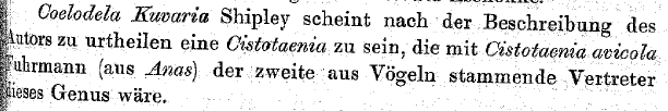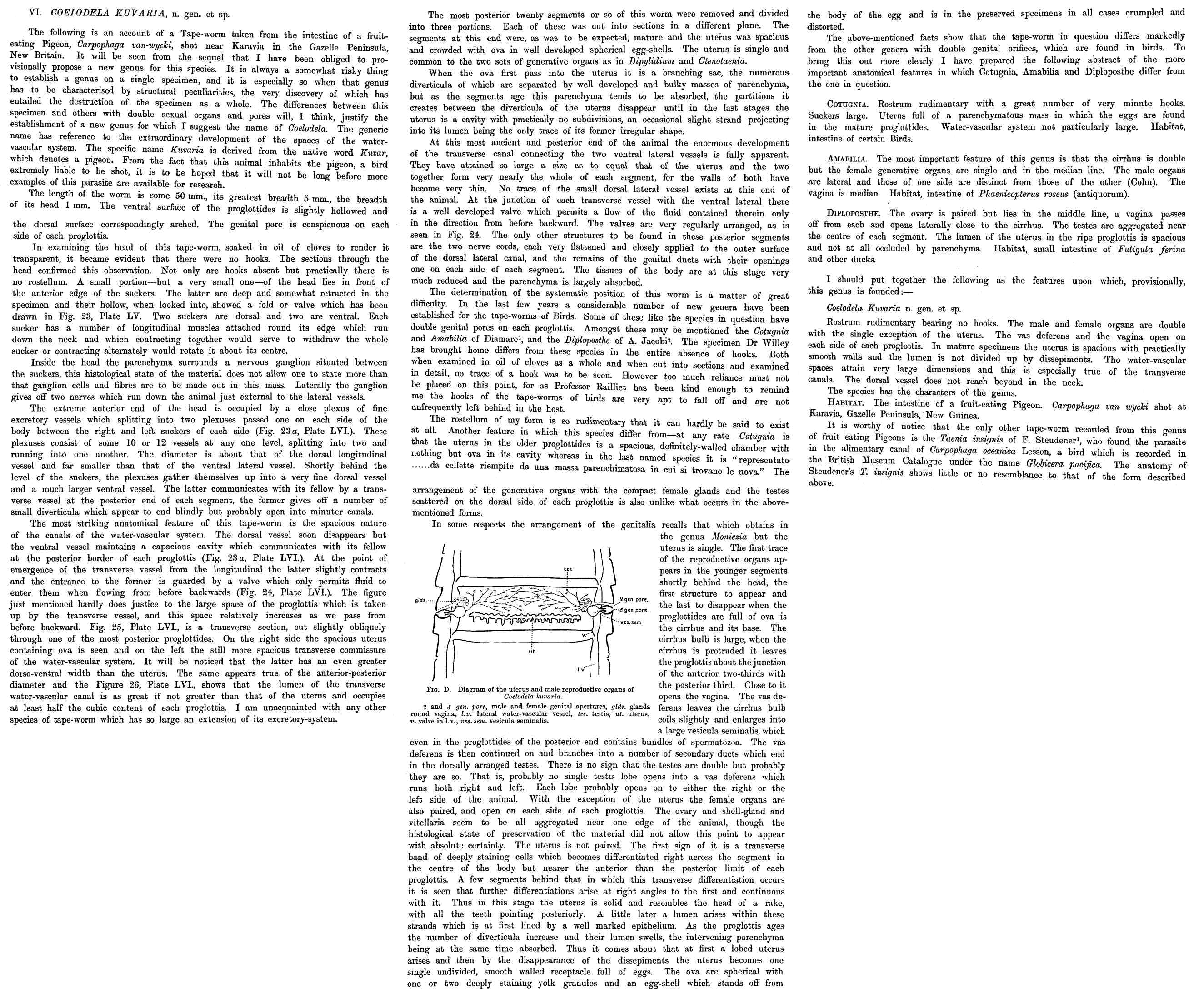 Shipley, A. E. 1900. A description of the Entozoa collected by Dr. Willey during his sojourn in the Western Pacific. Zoological Results based on material from New Britain, New Guinea, Loyalty Islands and elsewhere, collected during the years 1895, 1896, and 1897, by Arthur Willey. Part 5 : 531-568. (24) Download PDFFuhrmann, O. 1901. Neue Arten und Genera von Vogeltaenien. Zoologischen Anzeiger 24: 271-273. (3023) Download PDF |