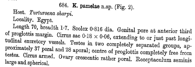 Meggitt, F. J. 1927. Report on a collection of Cestoda, mainly from Egypt. Part I. Families Anoplocephalidae, Davaineidae. Parasitology 19: 314-327.