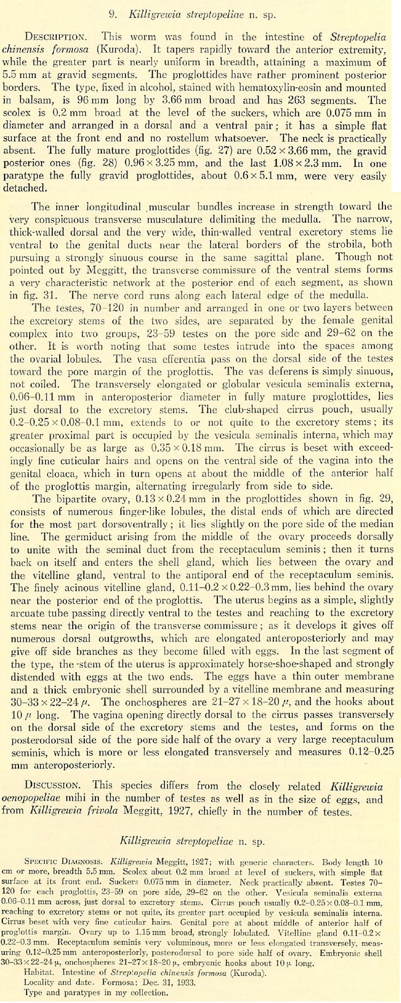 Yamaguti, S. 1935. Studies on the Helminth Fauna of Japan. Part 6. Cestodes of birds, I. Japanese Journal of Zoology 6 (2): 183-232.